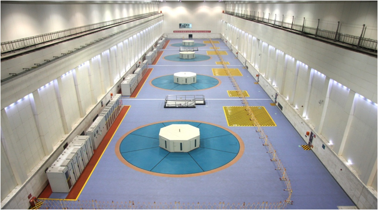 >> 鋼筋混凝土引水隧洞,最大水頭748m,最大滲漏量分別為5.01L/s和3.63L/s;地下廠房洞群總滲漏量4.85L/s,為國內領先水平。(上圖為電站地下洞室群)