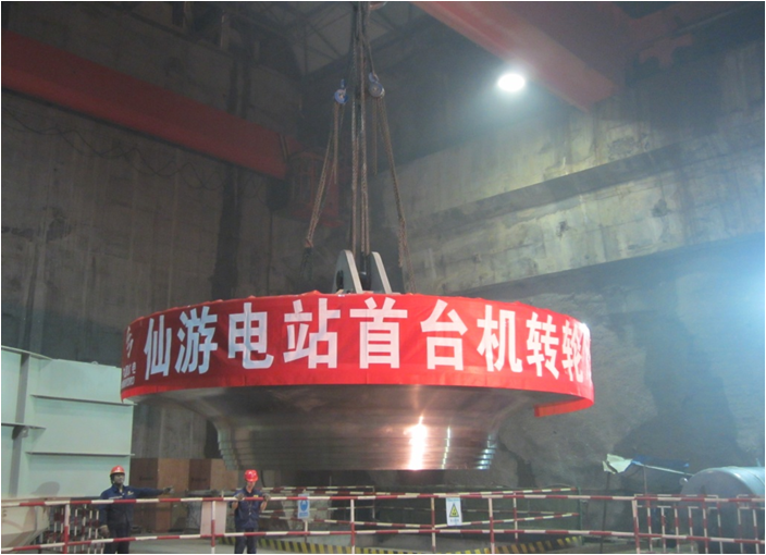 >>主要設備 采用我國首台自主創新、自主研製的500m水頭段300MW級高水頭大容量抽水蓄能機組,應用我國自主研發、製造、安裝的單根超千米的500kV電纜及終端。(右圖:抽水蓄能機組轉輪吊裝)