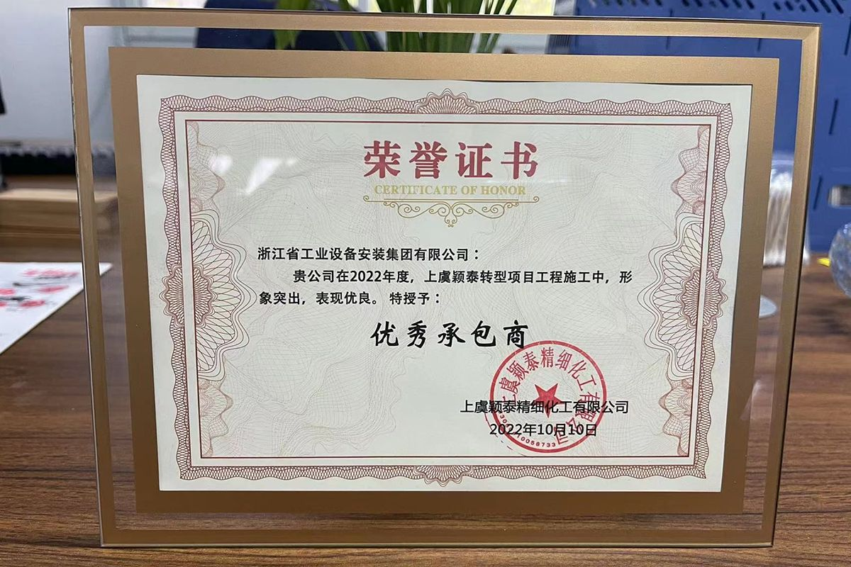 10月10日,浙江省工業設備安裝集團有限公司第三分公司承建的上虞穎泰精細化工有限公司農藥原藥產品轉型升級及副產精酚綜合回收利用項目(一期)工程收到業主單位頒發的優秀承包商、工期進度優秀獎、安全質量優秀企業等多項榮譽證書。