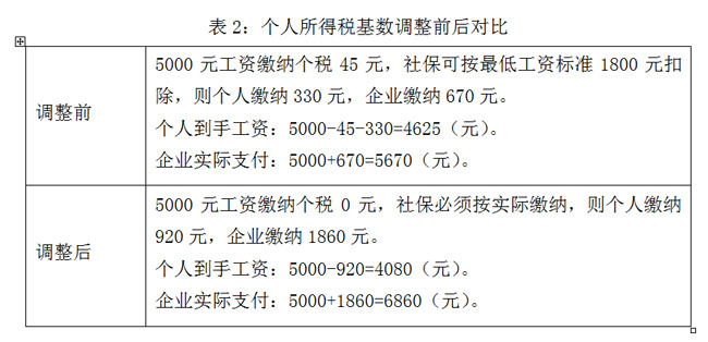 對比結論:上調個稅基數後,個人實際收入減少,4080元<4625元;企業實際負擔增加,6860元>5670元。